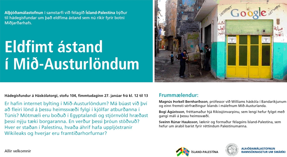 Laugardagur 29. janúar 2011 Á málþingu um hið eldfima ástand í Mið-Austurlöndum sem haldið var föstudaginn 28. janúar í Háskóla Íslands greindi Sveinn Rúnar Hauksson, formaður Félagsins Ísland-Palestína, frá stöðu mála í Palestínu eftir nýlegt ferðalag um svæðið. Uppljóstranir Aljazeera-sjónvarpsstöðvarinnar síðustu daga, meira en 1.600 skjöl, „Palestínu-pappírarnir“ greina ekki síst frá náinni samvinnu palestínskra yfirvalda í Ramallah við ísraelsku leyniþjónustuna, sem og við CIA og MI6. Einnig greina þau frá mikilli eftirgjöf í samningaviðræðum, en þetta hefur þegar leitt til þess að Hamas-samtökin hafi dregið umboð sitt til baka gagnvart Abbas forseta. Hann geti því ekki lengur talist samningamaður allrar þjóðarinnar. Ræðu Sveins má lesa í heild sinni á vefnum. Athyglisvert er að í kynningu sinni fullyrt Bogi Ágústsson, fréttamaður Ríkissjónvarpsins, að samúð íslenskra fjölmiðla hefði legið með Ísrael fram að fjöldamorðunum í flóttamannabúðunum í Sabra og Shatila árið 1982 en þaðan af hefðu menn áttað sig á raunveruleika ísraelsks hernáms.